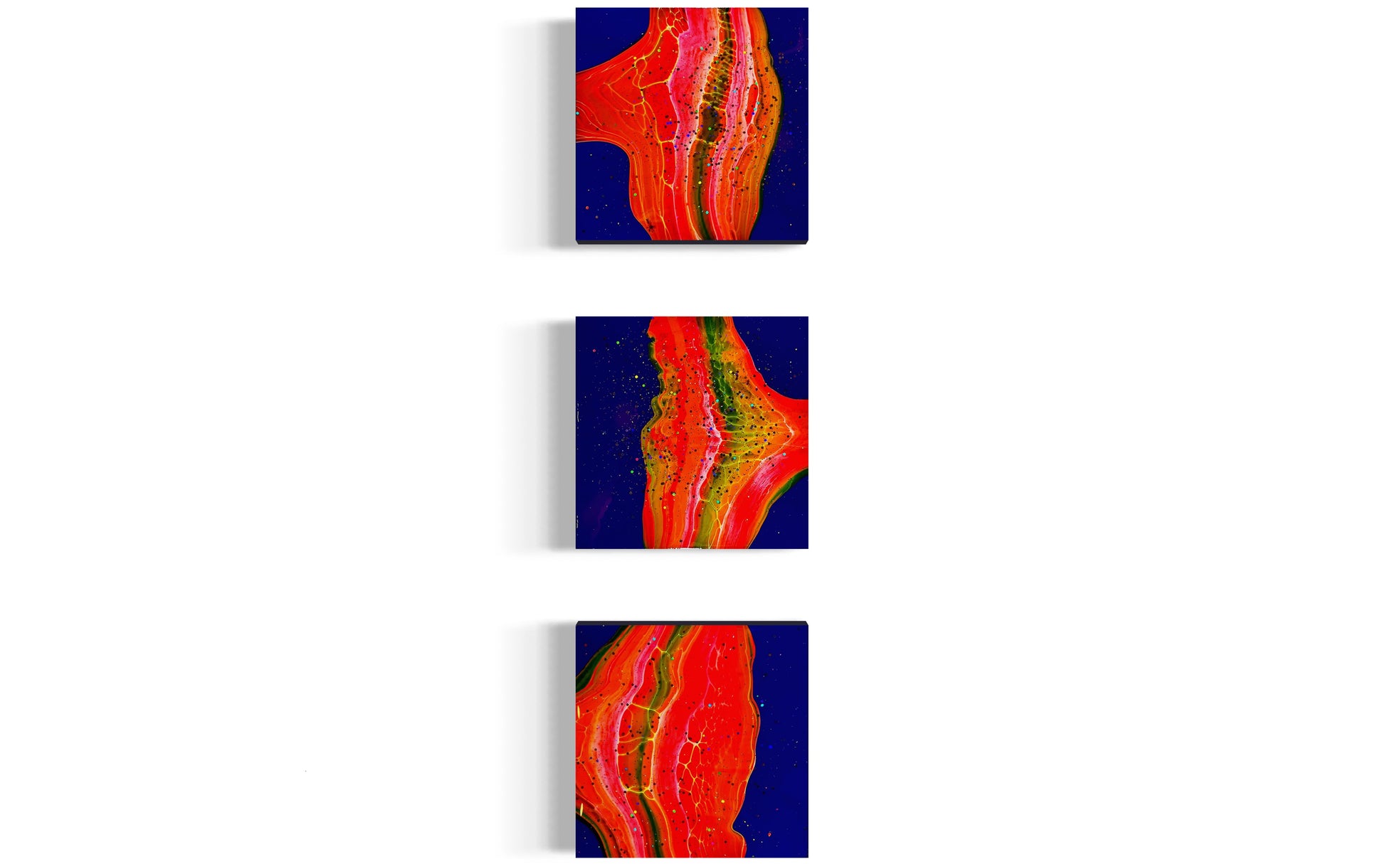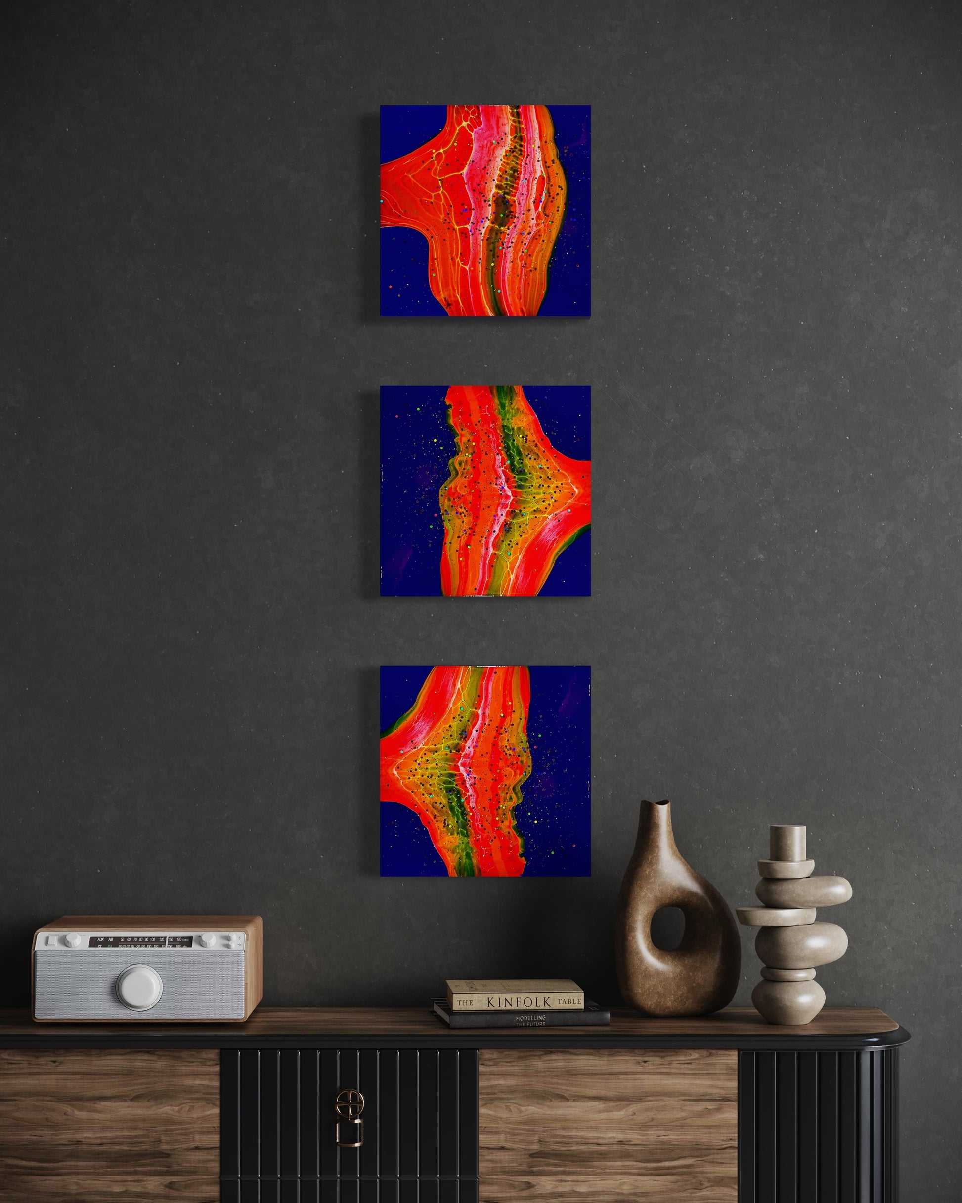I painted this piece using the "dustpan" technique with a dark violet base and fluorescent orange, yellow, red, and a touch of green acrylic paints on 3 gallery-wrapped 12 x 12 inch canvases. These will glow in blacklight! These are sold as a set.